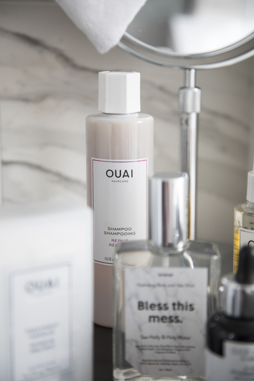 Question produits, j’aime énormément les soins, et parmi mes favoris on trouve le “Masque Traitement“, le “Volume Spray” et le “Shampooing Réparateur” de OUAI Haircare, “L’Huile Secret de Beauté” de Leonore Greyl, le “Sérum Revitalisant Fortifiant” de Hair Rituel by Sisley et la brume “Bless this Mess” de Anese. Tous ces produits apportent à mes cheveux force et santé. Par exemple, le sérum de Hair Rituel contribue à un cheveu plus fort et plus dense. Il lutte aussi contre la chute des cheveux (je perds mes cheveux en automne pour le coup). Un petit bijou pour tous que l’on utilise en cure quand notre chevelure est terne.