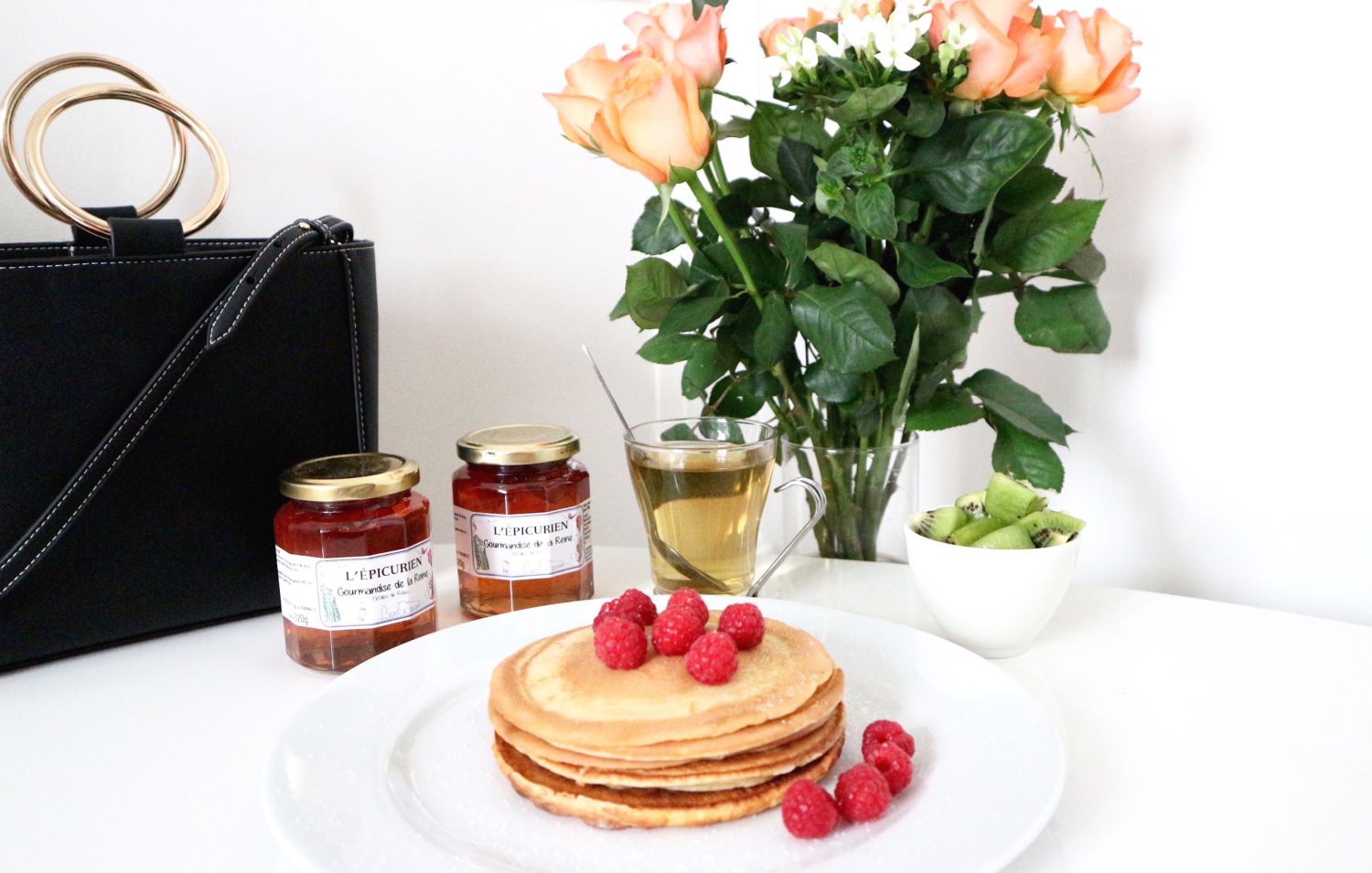 Pour accompagner mes pancakes, j’opte souvent pour des framboises mais récemment, j’ai découvert la Gourmandise de la Reine de L’Épicurien aux pétales de roses. Ce confit fleuri est une création  en hommage aux trois femmes qui ont marqué de leur passage les châteaux de la Loire : Catherine de Médicis, Diane de Poitiers et la Reine Claude épouse de François 1er. Je suis Orléanaise et j’ai grandi en Sologne donc je me sens un peu proche de cette petite douceur qui donne une note légère à mes pancakes. Vous pouvez aussi associer cette gelée à votre kir, en nappage d’un cheesecake ou encore sur une tartine de chèvre frais. Moi qui avait du mal avec la rose, je suis vraiment surprise de voir qu’elle s’associe avec énormément de produits.