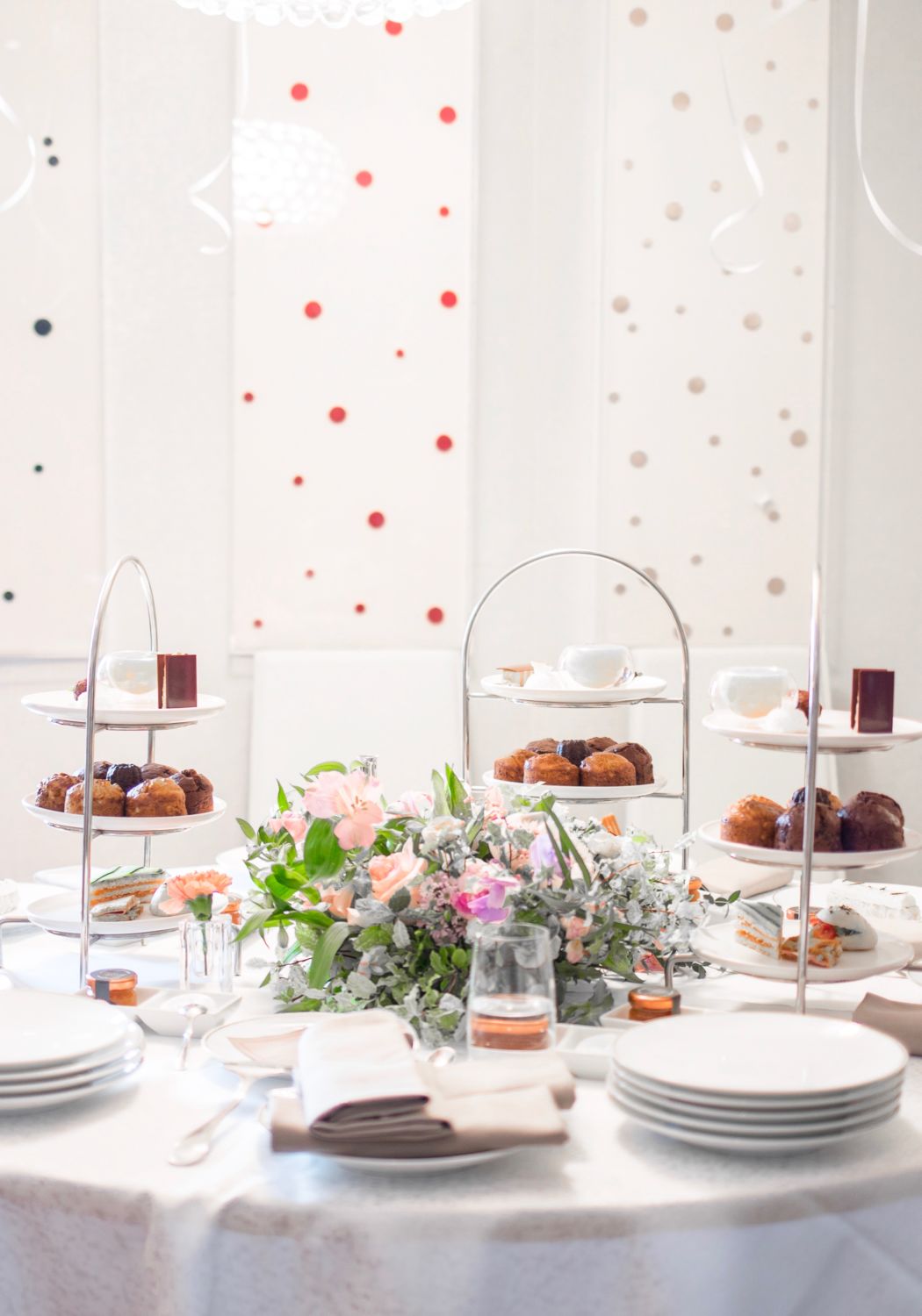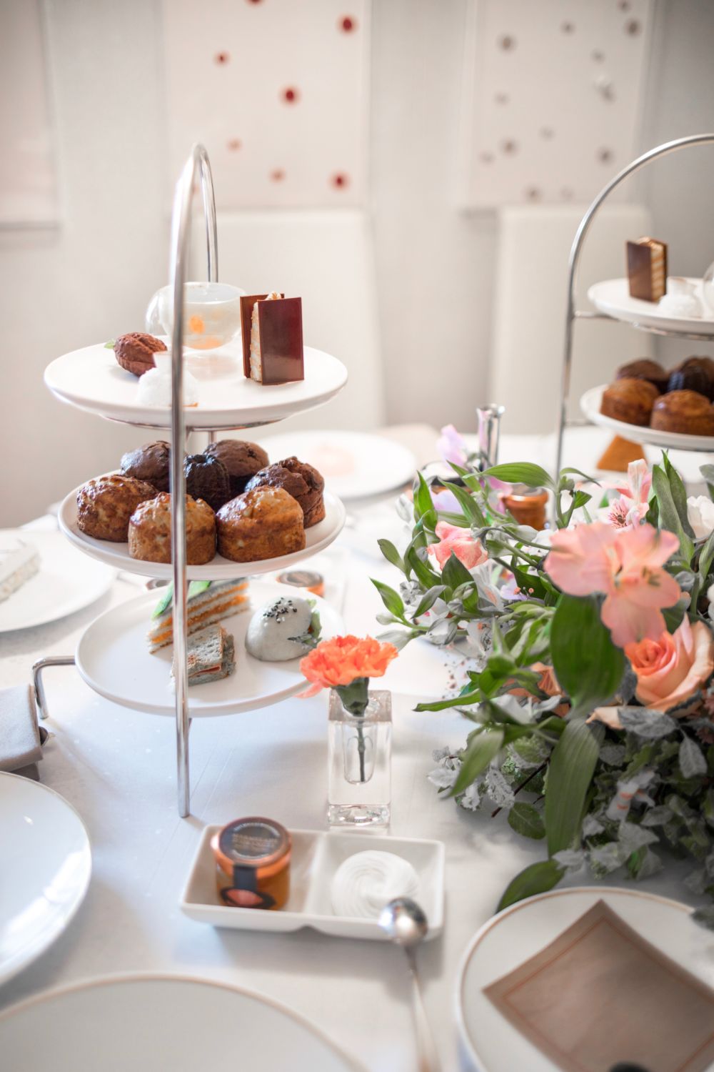 Au cœur de cette grande suite du Mandarin Oriental était disposée une table où l’on pouvait trouver de nombreuses pâtisseries. Au centre, les fleuristes de Pampa avaient imaginé une adorable composition fleurie pour donner du peps à cette tablée délicieuse. Entre feuillages et fleurs aux teintes claires, la touche élégante et champêtre était présente. Si seulement je pouvais avoir une telle mise en fleurs sur ma table à chaque fois que je reçois… Le rêve non ?!