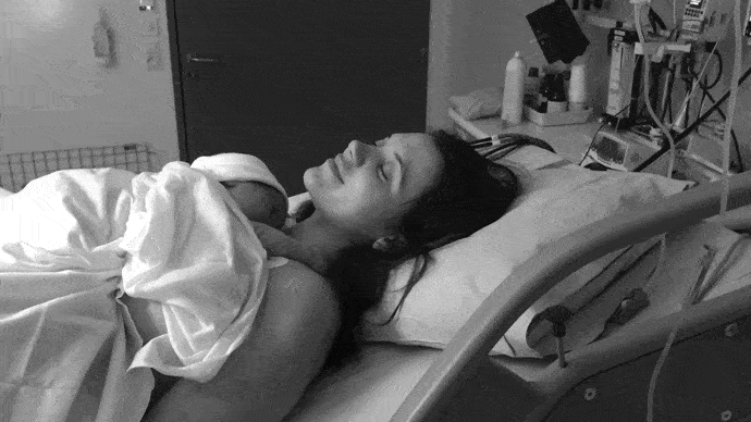 Au bout des 3 heures mon duo de sages-femmes est arrivé. Des fées. Elles étaient adorables et encourageantes au possible. Elles allaient m’aider à mettre au monde mon fils. Il est donc 22h15 et j’allais commencer à pousser. Ahhh la poussée ! Un vrai sujet ça aussi. Sachez que nous savons TOUTES le faire. Notre corps est fait pour donner la vie et bien que ce moment soit redouté parce que ça nous paraît complètement dingue, c’est très simple, cela demande juste de l’énergie et du souffle. Pendant 30 minutes j’ai donc donné tout ce que j’avais pour que bébé sorte mais il n’était pas décidé à pointer le bout de son nez. Je regardais Baptiste qui m’encourageait comme un fou et qui me tenait la nuque ainsi que ma jambe droite. J’ai tout donné mais au bout de 30 minutes il a fallu appeler une interne (vraiment trop chouette) et un médecin pour aider bébé à sortir. J’ai donc eu le droit aux spatules afin de faire un “toboggan” à mon tout petit. J’ai poussé poussé poussé et là Baptiste m’a regardé et m’a dit : “Ça y est il arrive, je le vois !”.