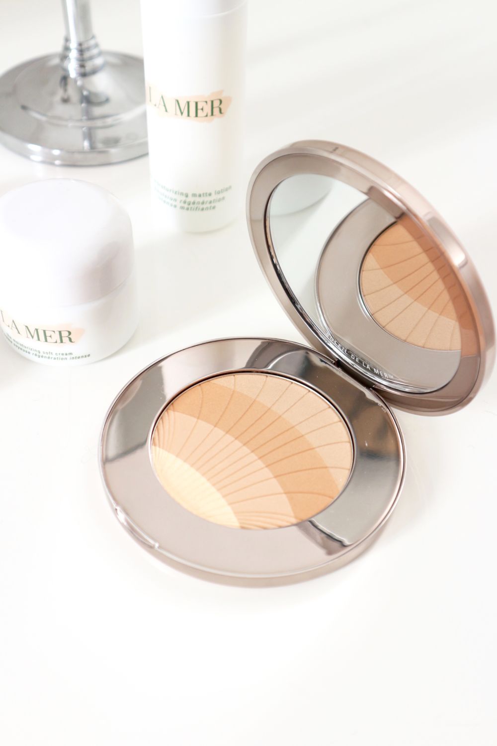 Un peu plus tard, j’ai eu la chance de découvrir via, La Mer, trois autres produits : La Crème Soyeuse Génération Intense, L’Emulsion Régénération Intense Matifiante et La Poudre Bronzante. J’ai d’abord commencé à tester la crème. J’avais entendu parlé par toutes les journalistes de la précieuse Crème de La Mer alors quand j’ai eu dans mes mains ce pot, j’ai eu l’impression de tenir une pépite. Pourquoi tant de bruit autour de ce soin ?  Tout simplement parce qu’il marche et fabuleusement bien. Inspiré par les pouvoirs de guérison de la mer, le Dr Max Huber, physicien et fondateur de La Mer, se lança dans une quête personnelle pour transformer l’apparence de sa peau, brûlée lors d’une expérience de laboratoire. Maîtrisant l’art de la bio-fermentation, il fût l’un des premiers à utiliser des algues marines dans un soin pour le visage. Il lui fallut 12 années et 6000 expériences pour inventer l’iconique Crème de la Mer. Résultat, sa peau en fût visiblement transformée. Grâce aux algues du Pacifique, aux vitamines, aux minéraux, aux huiles essentielles d’agrumes, à l’eucalyptus, aux germes de blé, de luzerne et de tournesol, le Miracle Broth™ est né et vous pouvez le trouver dans chaque crème de la maison.